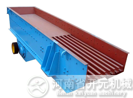 槽式給料機又稱往復式或擺動式給料機,它是貯礦槽排料應用較早的一種給料設備。型式較多,其結構的共同點是均裝有可控制料層高度的調節(jié)閘板;在輸料槽下部為一前后移動的給料板。其不同點是給料板角度不一樣,一般為沿卸料方向向下傾斜5度以及更大的傾角(小于物料的靜堆積角)和角度為零的水平型等。給料板的動作有前后往復移動式,抖動式以及擺動式等。傳動機構均為曲柄回轉式。