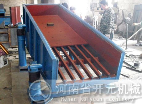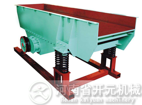 槽式給料機又稱往復式或擺動式給料機,它是貯礦槽排料應用較早的一種給料設備。型式較多,其結構的共同點是均裝有可控制料層高度的調節(jié)閘板;在輸料槽下部為一前后移動的給料板。其不同點是給料板角度不一樣,一般為沿卸料方向向下傾斜5度以及更大的傾角(小于物料的靜堆積角)和角度為零的水平型等。給料板的動作有前后往復移動式,抖動式以及擺動式等。傳動機構均為曲柄回轉式。
