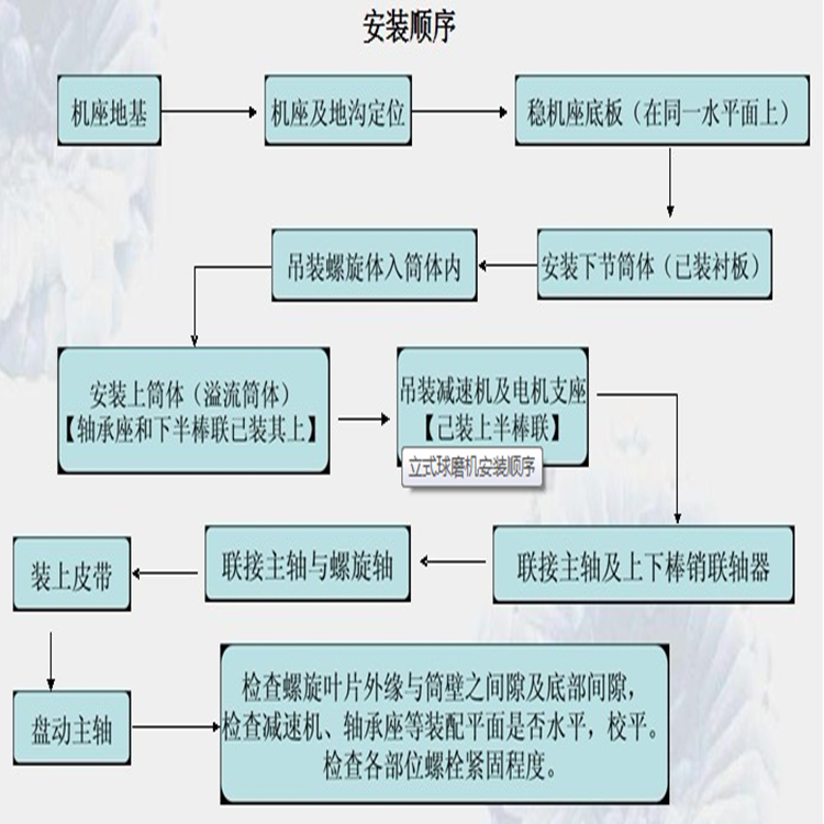 立式螺旋攪拌磨礦機(jī)是我公司研制出來用于進(jìn)行細(xì)磨、超細(xì)磨的設(shè)備,工作效率高,處理量大,具有很多方面的優(yōu)勢(shì),廣泛受到用戶們的認(rèn)可與青睞。那么該設(shè)備對(duì)于安裝有哪些方面的要求呢?今天我們就一起來了解下如何正確的安裝該設(shè)備。